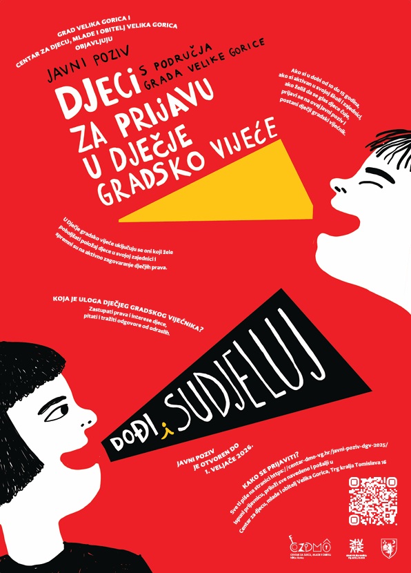 Grad Velika Gorica i Centar za djecu, mlade i obitelj Velika Gorica uputili su Javni poziv djeci i mladima s područja Velike Gorice, u dobi od 10 do 15 godina, da se prijave i postanu članovi Dječjeg gradskog vijeća. Riječ je o prilici da djeca postanu aktivni sudionici svoje zajednice te svojim idejama, prijedlozima i inicijativama doprinesu kvalitetnijem životu djece u gradu.