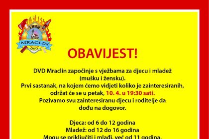 Dobrovoljno vatrogasno društvo Mraclin započinje s organizacijom vježbi za djecu i mlade,…