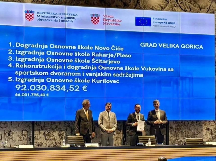 Naglasio je kako će zahvaljujući odobrenim sredstvima Velika Gorica dobiti tri potpuno nove škole – u Kurilovcu, Rakarju/Plesu i Šćitarjevu – dok će se postojeće škole u Vukovini i Novom Čiču rekonstruirati i dograditi.